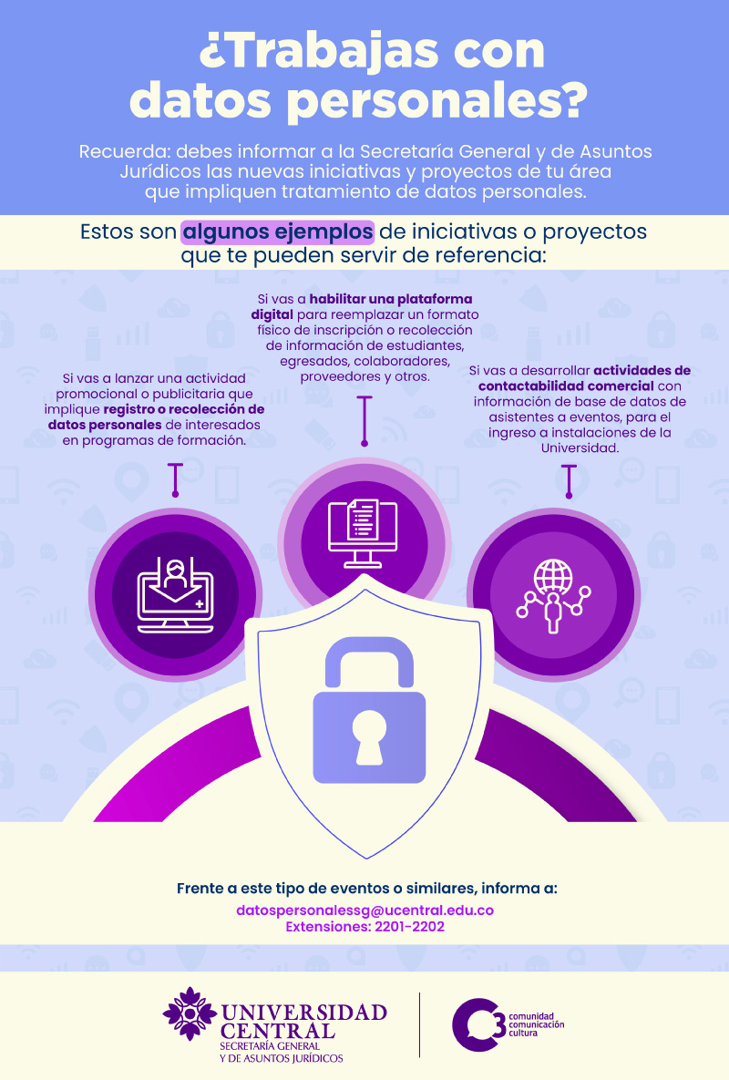 Para la Universidad Central es muy importante velar por la protección de datos personales que se recolectan, almacenan, tratan y administran en la gestión de sus actividades misionales. Sobre este tema, conoce la política institucional y una presentación sobre el modelo de gestión y cumplimiento de protección de datos de nuestra Universidad.