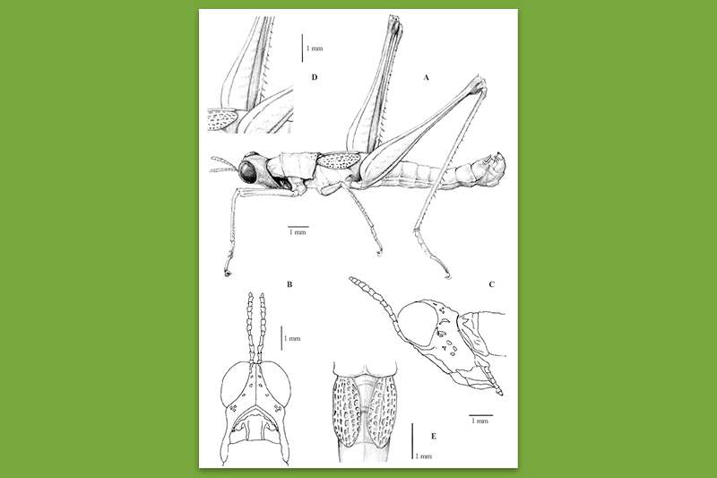 Porras (2007). Zeromastax selenesii n. sp. ♂. A. Hábito. B. Cabeza en vista dorsal. C. Cabeza en vista lateral. D. Pata posterior. E. ay. https://www.researchgate.net/figure/Figura-1-Zeromastax-selenesii-n-sp-A-Habitus-B-Cabeza-en-vista-dorsal-C-Cabeza_fig1_235925015